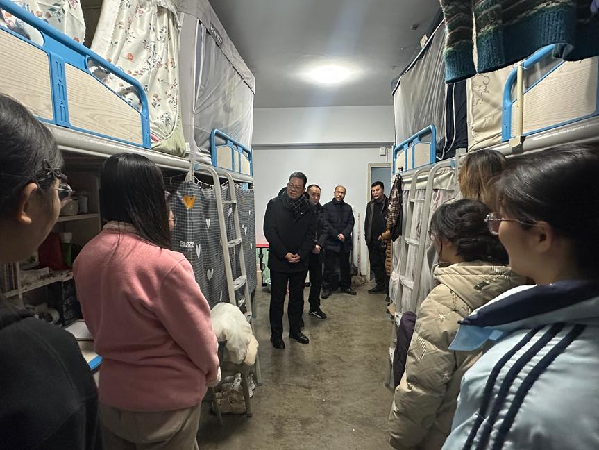 走访期间,左国防与同学们亲切交谈,详细询问大家的学习进度、科研实践、生活状况以及寒假返乡安排。当了解到部分同学正投身于化工专业实验项目时,他叮嘱大家要注重实验安全,鼓励大家在科研探索中勇于创新、敢于突破;并勉励同学们珍惜大学时光,打牢专业基础,练就过硬本领,努力成长为可堪大用、能担重任的栋梁之才。走访过程中,他还仔细查看了宿舍的供暖、水电等生活保障设施,要求学院相关负责人时刻把学生的冷暖放在心上,及时解决学生遇到的实际困难,为同学们营造舒适、安心的学习生活环境。