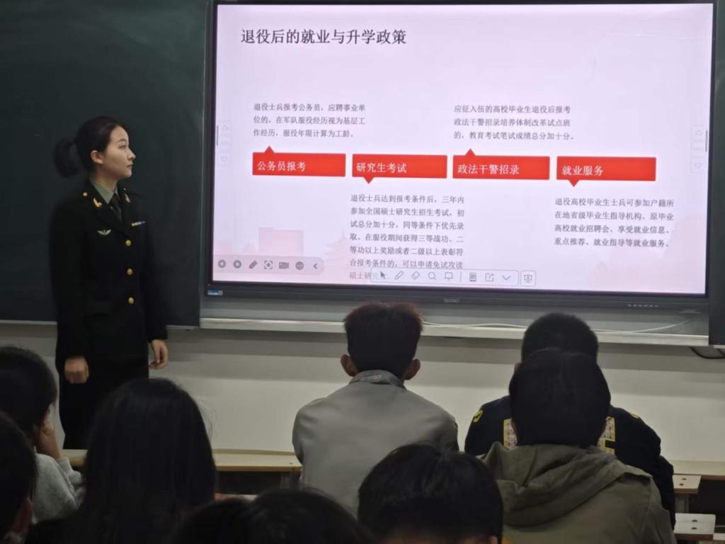 结合毕业生就业工作和征兵工作要求,学院着力针对应届毕业生开展征兵宣讲活动。4月28日晚,学院召集在校应届毕业生和有意向参军的其它年级学生代表召开征兵动员大会,邀请学院退役复学同学多角度解读征兵政策,讲述真实兵营生活。重点针对应届毕业生入伍问题,从毕业就业、学费代偿、退伍政策、学校支持等多方面进行详细解读和答疑,动员更多有志学子参军入伍报效祖国。